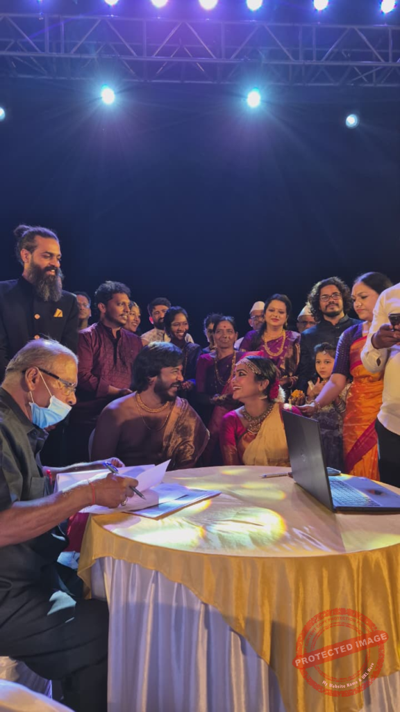 15 April 2026 : Officially tied the knot under the Special Marriage Act in a ceremony held on a performance stage, marking the culmination of their 13-year-long friendship. The ceremony, hosted at the Zapurza Art Studio in Kudje, stood out as a rare instance where the bride commenced her marital journey by performing a full Bharatnatyam recital. Art as a Wedding Vow The highlight of the evening was Vaishnavi’s performance, where she presented traditional ‘Alarippu’, ‘Varnam’, ‘Sakhi He’, ‘Jayadev’, and ‘Tillana’. Dressed in traditional dance attire and accompanied by the rhythmic sound of ghungroos, the performance served as a creative substitute for customary rituals, leaving the audience spellbound.